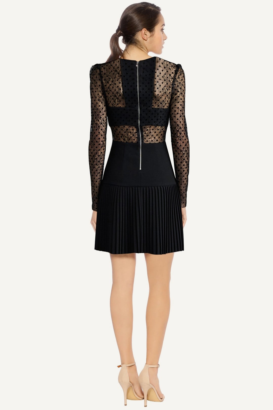 A chic blend of sophistication and charm, this black mini dress features sheer polka-dot sleeves with subtle puff shoulders and a fitted bodice. The pleated skirt gives it a graceful flow, making it ideal for formal dinners or elegant gatherings.