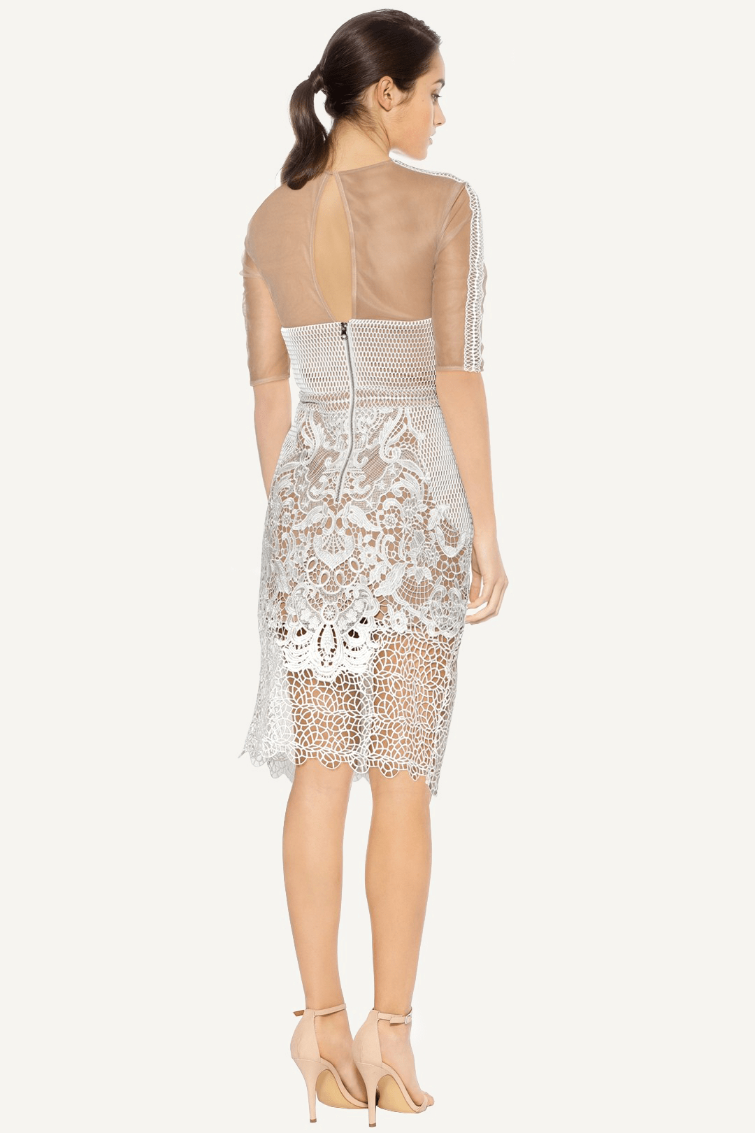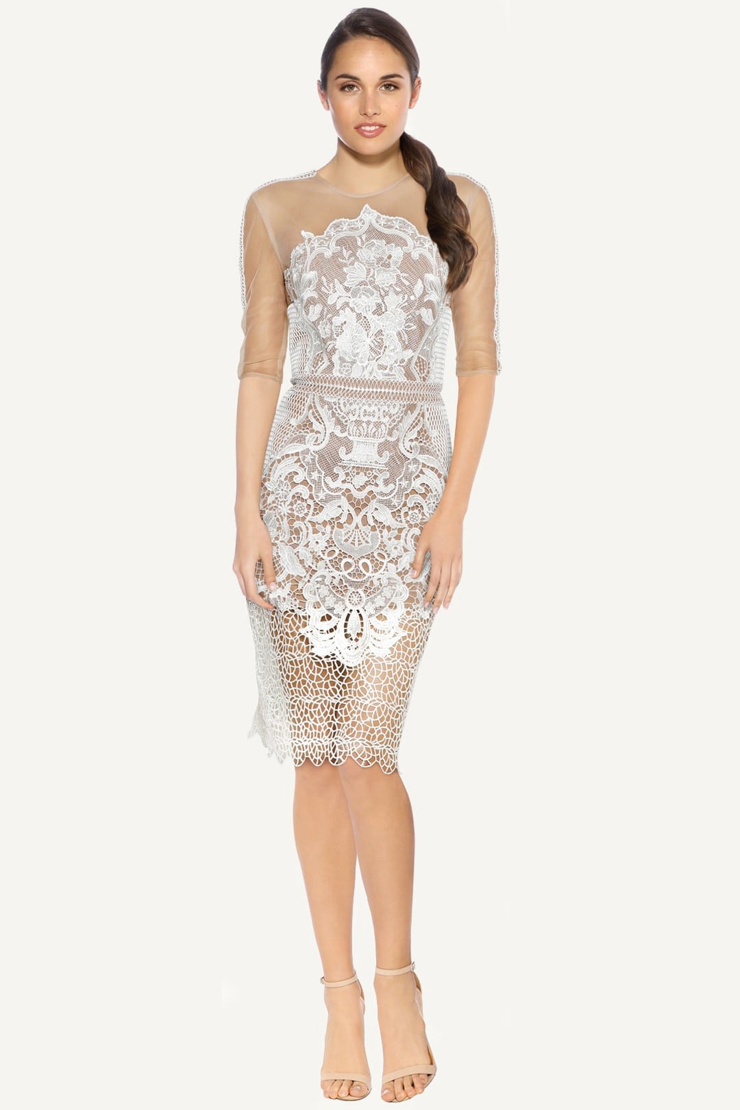 Step into timeless elegance with this intricately designed white lace midi dress. The sheer detailing on the neckline and sleeves adds a touch of sophistication, while the body-hugging fit beautifully enhances your curves. Perfect for engagement parties, receptions, or classy soirƩes.